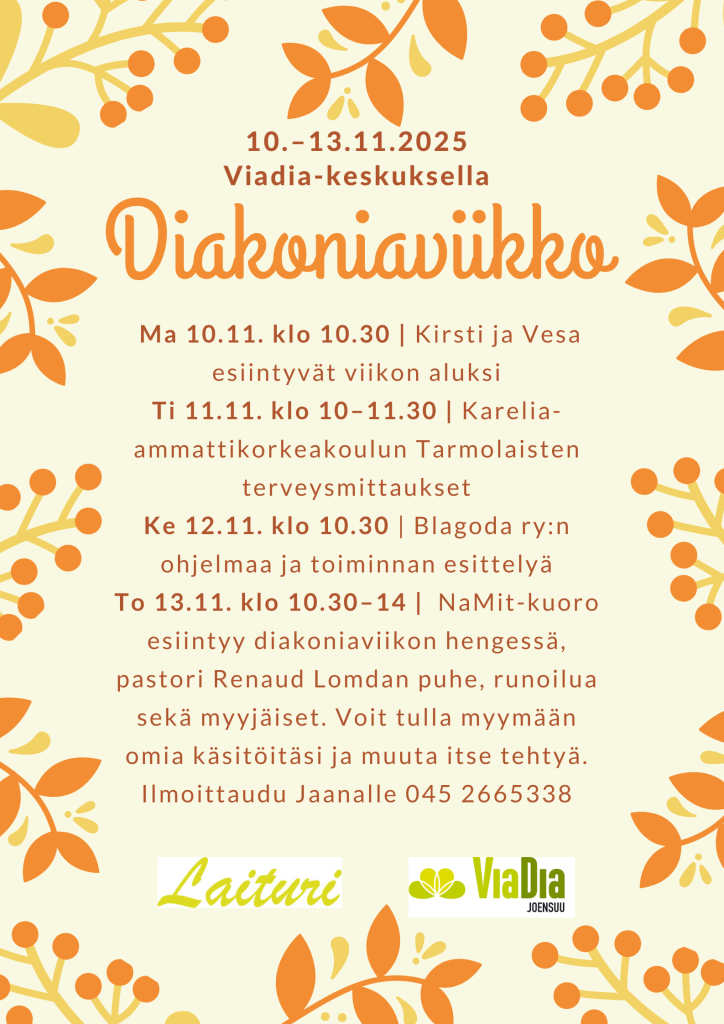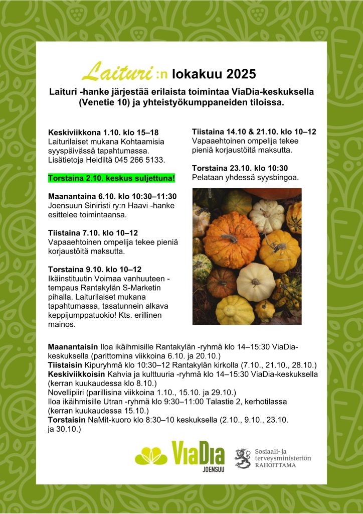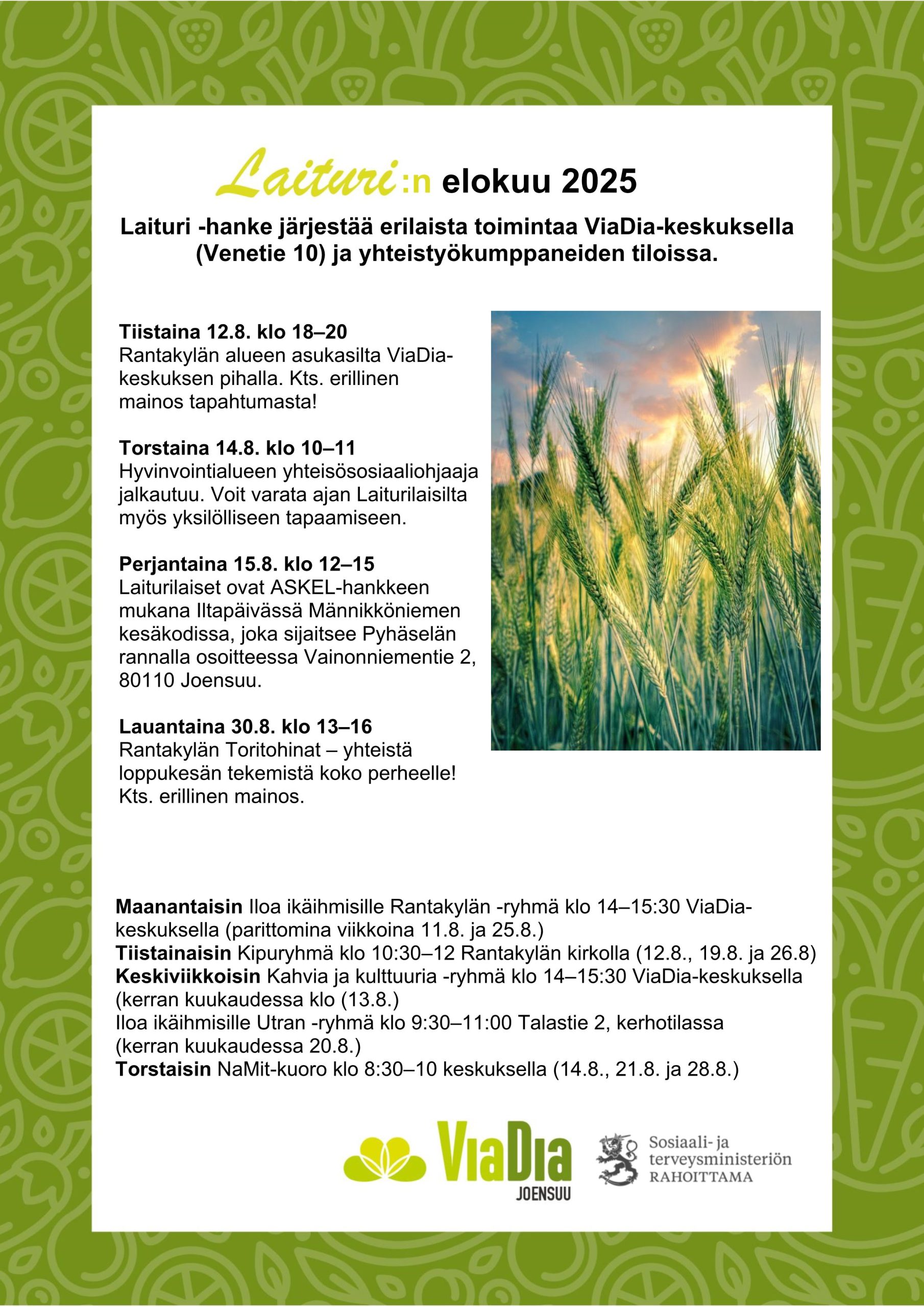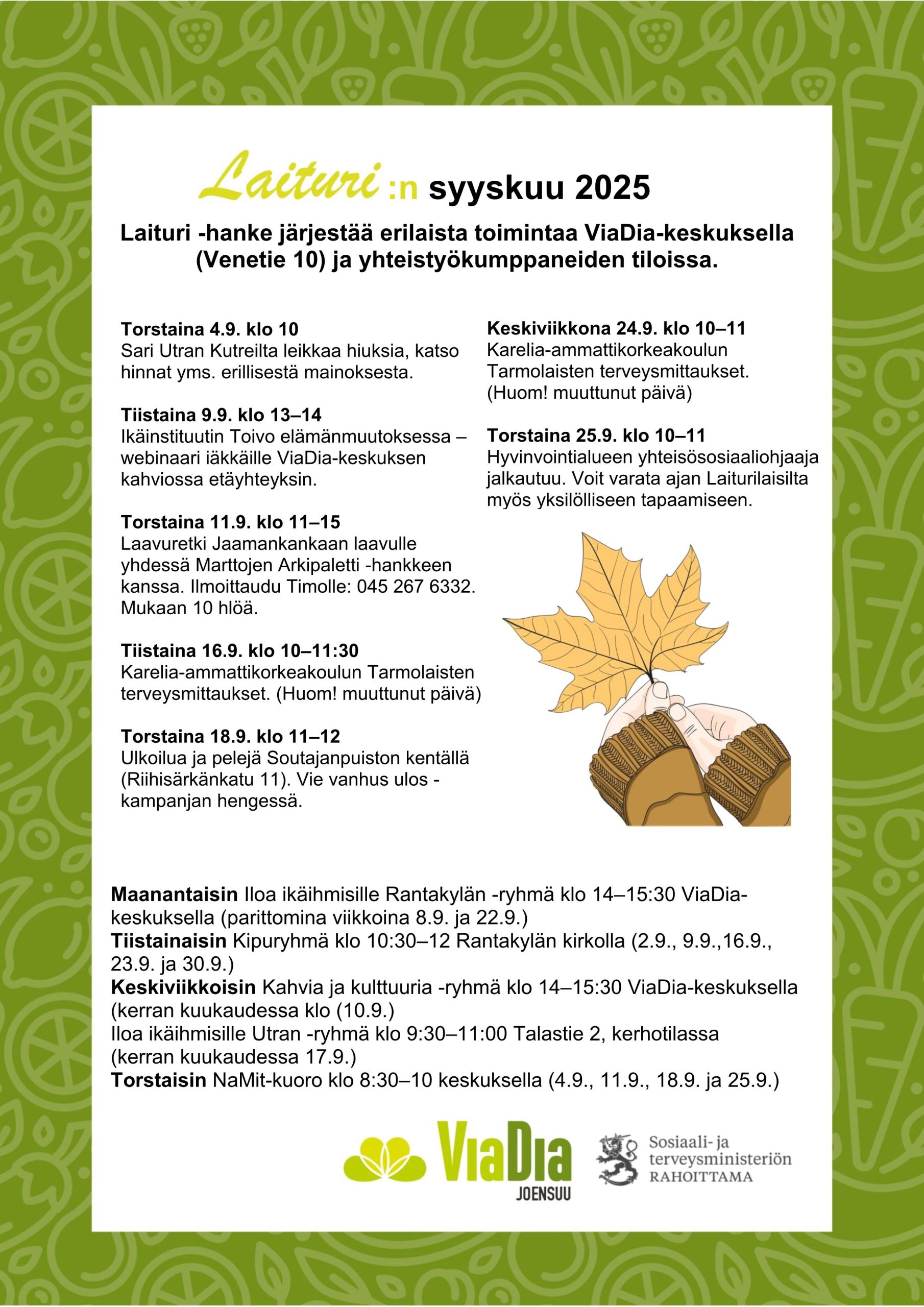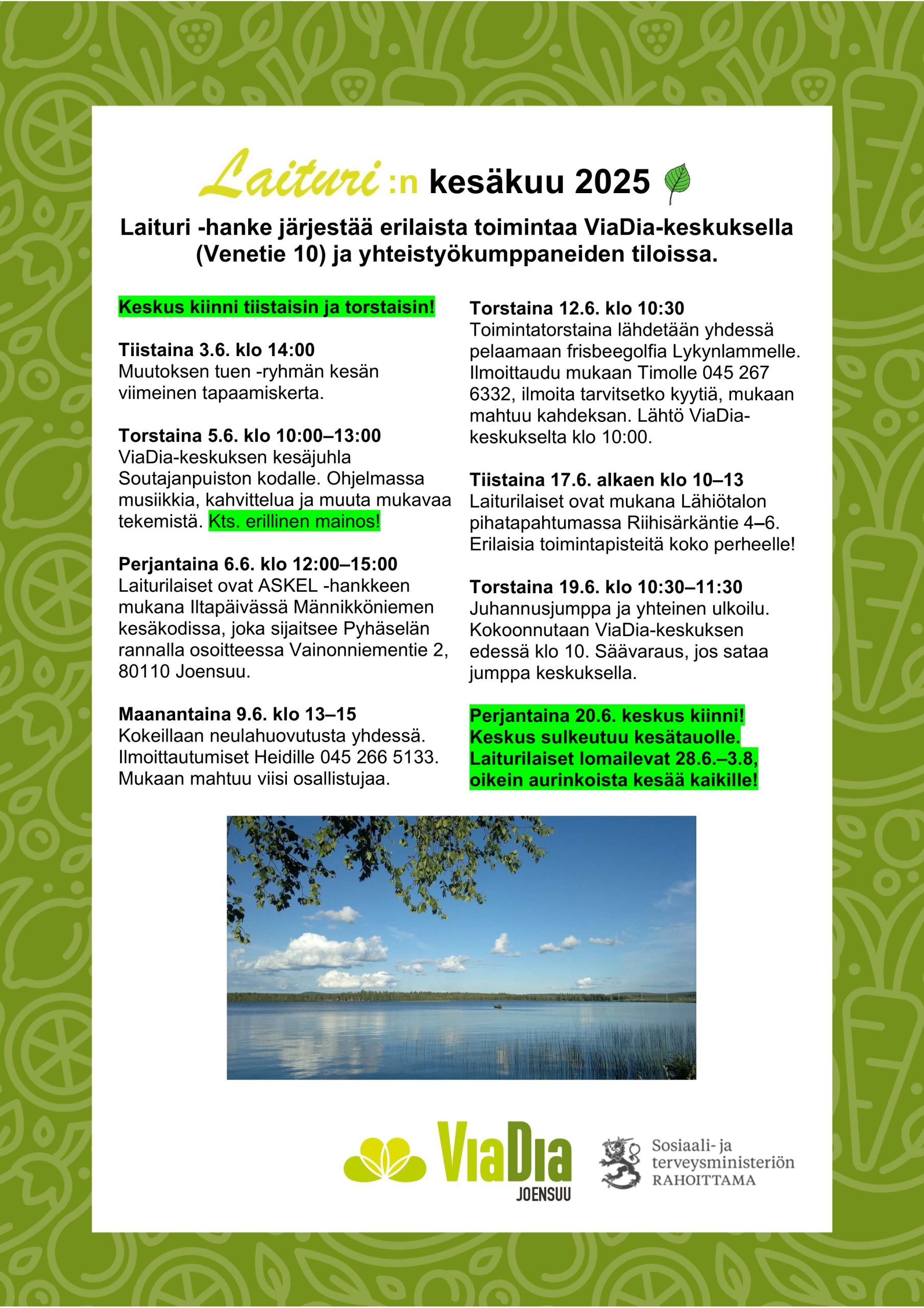 Laiturin ajankohtaista Lokakuu 2025Lataa Syyskuu 2025Lataa Elokuu 2025Lataa Kesäkuu 2025Lataa Toukokuu 2025Lataa Huhtikuu 2025Lataa Maaliskuu 2025Lataa Helmikuu 2025Lataa Tammikuu 2025Lataa Joulukuu 2024Lataa Marraskuu 2024Lataa Syyskuu 2024Lataa Elokuu 2024Lataa Kesäkuu 2024Lataa Toukokuu 2024Lataa Huhtikuu 2024Lataa Maaliskuu 2024Lataa Helmikuu 2024Lataa Tammikuu 2024Lataa Joulukuu 2023Lataa Marraskuu 2023Lataa Syyskuu 2023Lataa Elokuu 2023Lataa Touko- ja kesäkuu 2023Lataa Laituri huhtikuu 2023Lataa Tervetuloa käymään ViaDia-keskuksella! Tietoa eri tapahtumista ja ryhmistä löydät Facebookista ja Lähellä.fi -palvelusta. Lähellä.fi | ViaDia Joensuu ry (lahella.fi)
