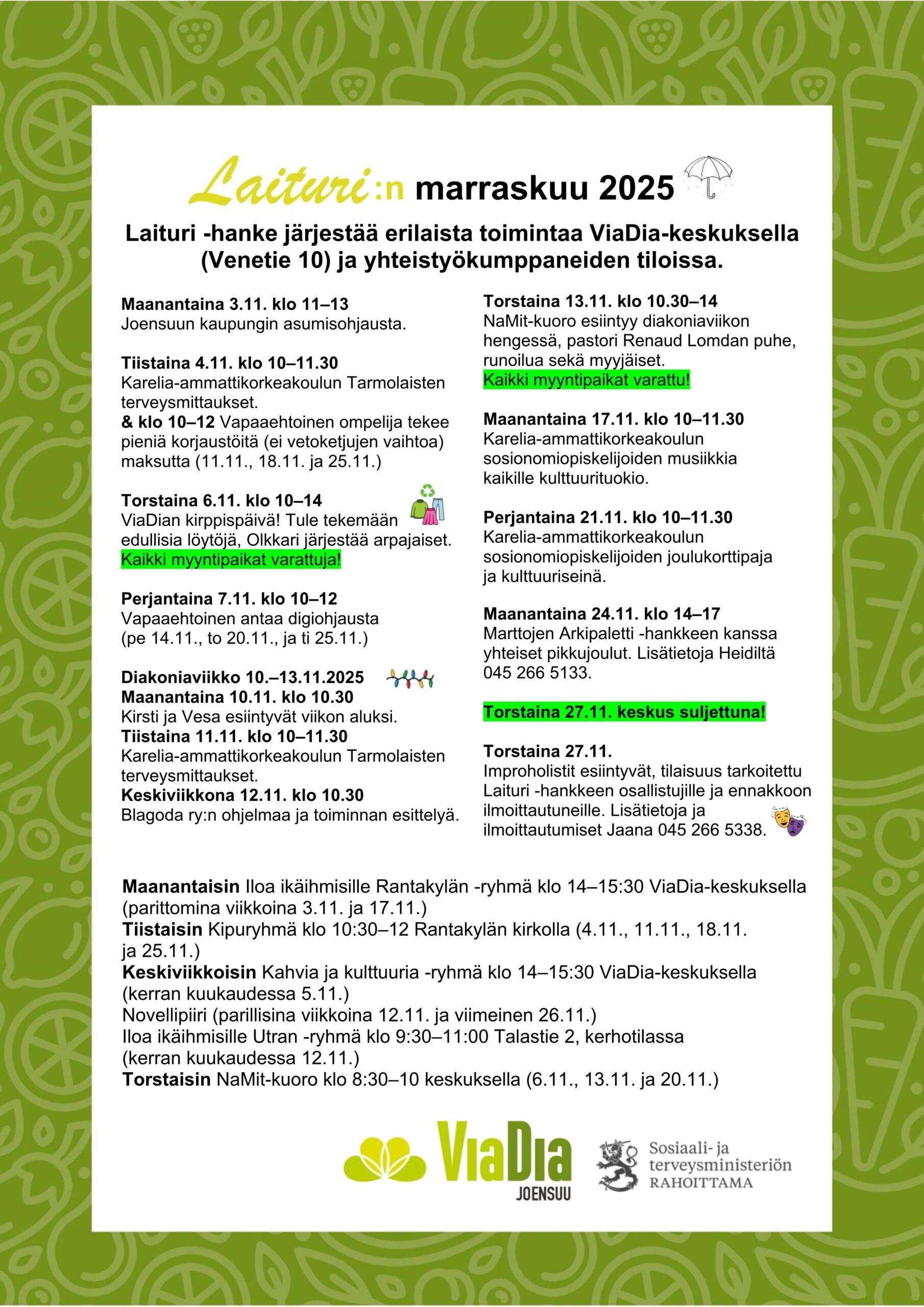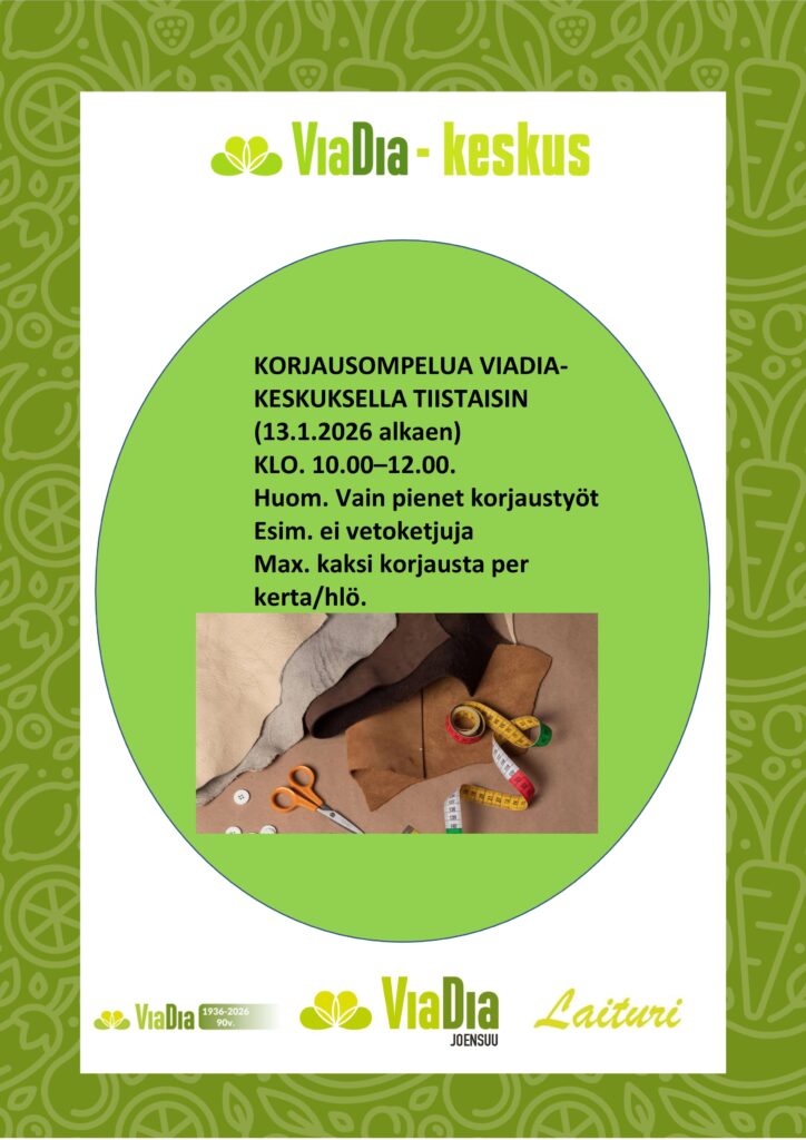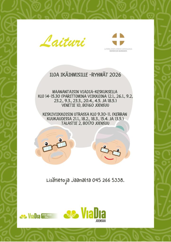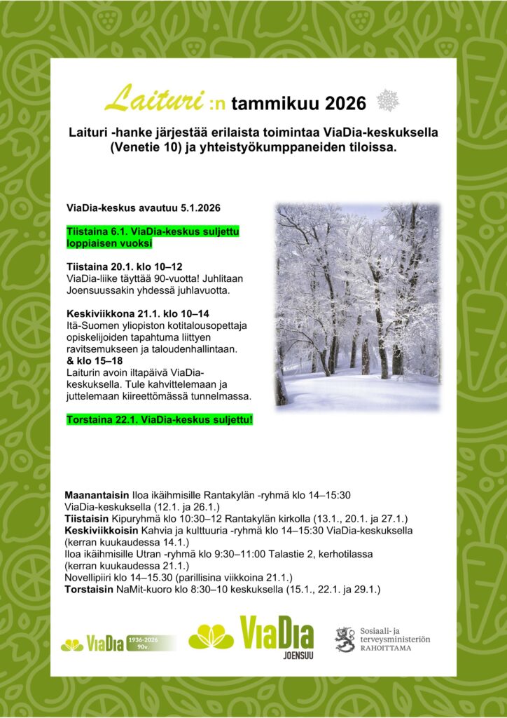 Laiturin ajankohtaista Tammikuu 2026Lataa Joulukuu 2025Lataa Marraskuu 2025Lataa Lokakuu 2025Lataa Syyskuu 2025Lataa Elokuu 2025Lataa Kesäkuu 2025Lataa Toukokuu 2025Lataa Huhtikuu 2025Lataa Maaliskuu 2025Lataa Helmikuu 2025Lataa Tammikuu 2025Lataa Joulukuu 2024Lataa Marraskuu 2024Lataa Syyskuu 2024Lataa Elokuu 2024Lataa Kesäkuu 2024Lataa Toukokuu 2024Lataa Huhtikuu 2024Lataa Maaliskuu 2024Lataa Helmikuu 2024Lataa Tammikuu 2024Lataa Joulukuu 2023Lataa Marraskuu 2023Lataa Syyskuu 2023Lataa Elokuu 2023Lataa Touko- ja kesäkuu 2023Lataa Laituri huhtikuu 2023Lataa Tervetuloa käymään ViaDia-keskuksella! Tietoa eri tapahtumista ja ryhmistä löydät Facebookista ja Lähellä.fi -palvelusta. Lähellä.fi | ViaDia Joensuu ry (lahella.fi)