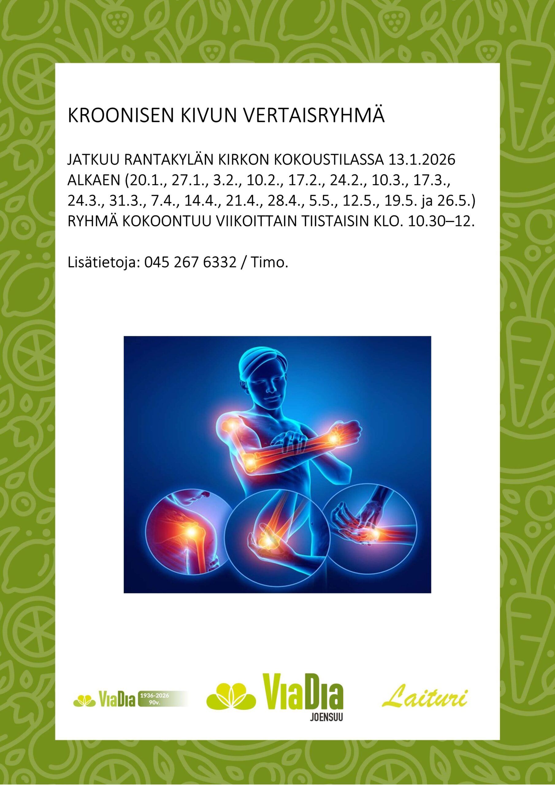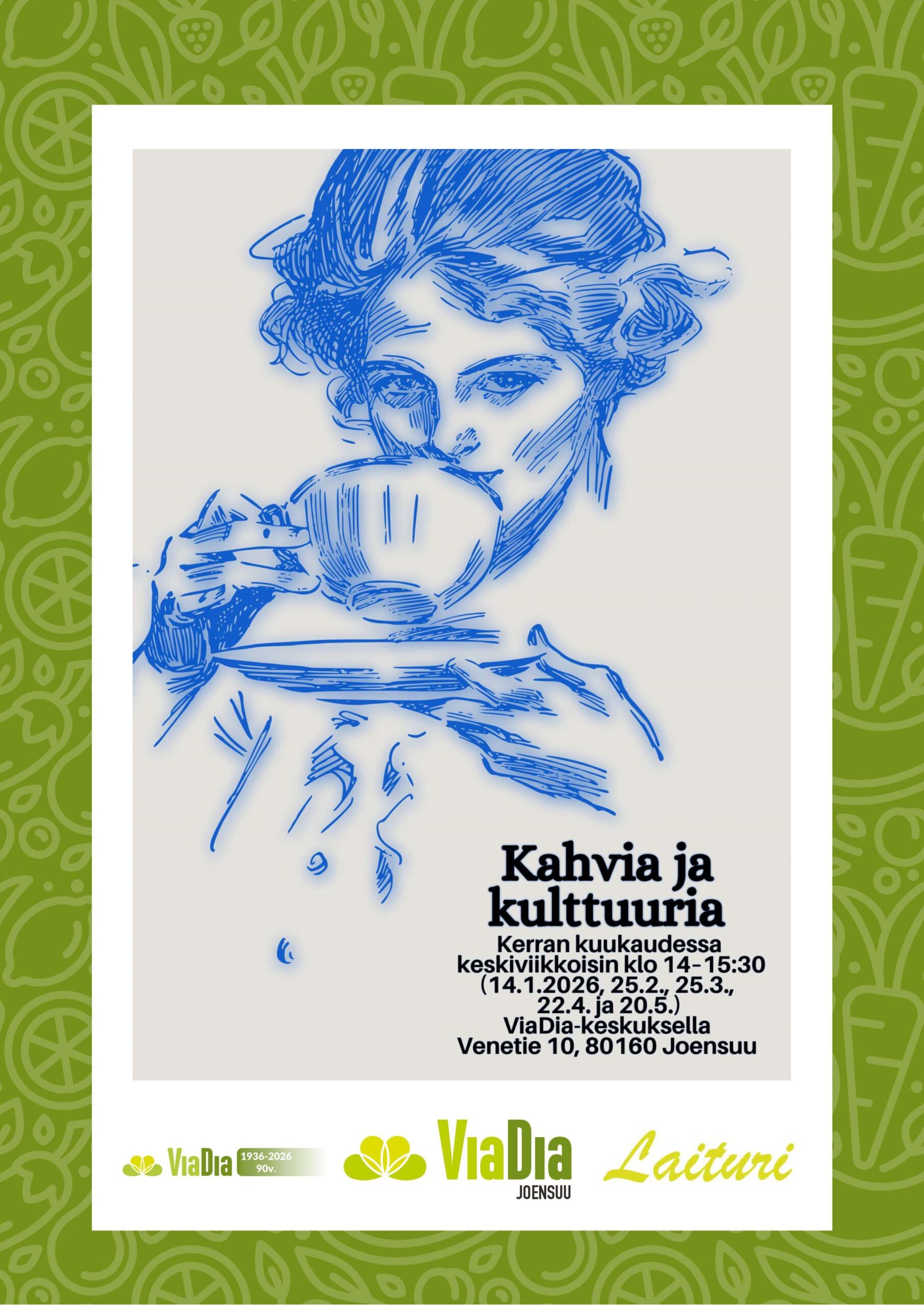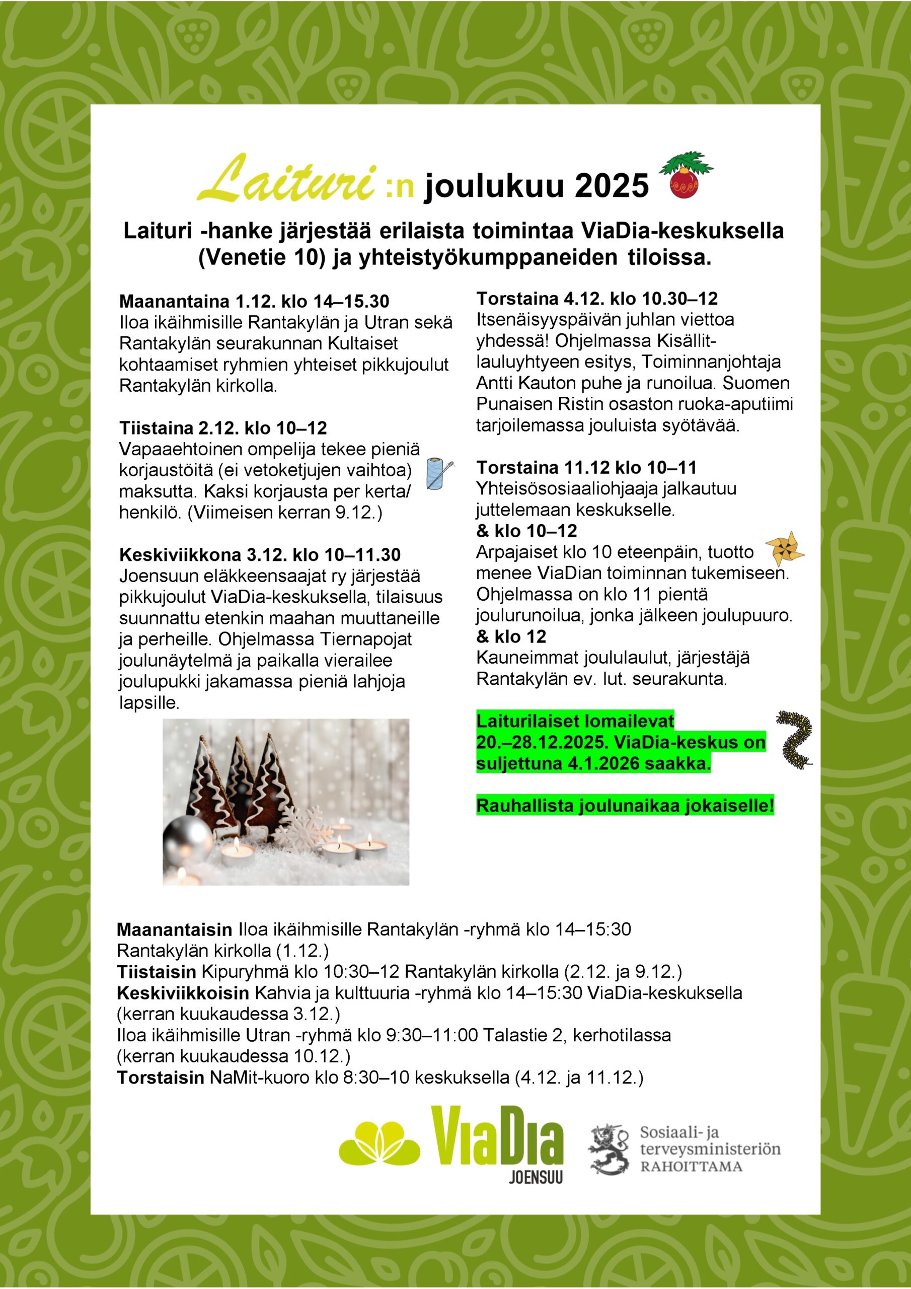 Laiturin ajankohtaista Tammikuu 2026Lataa Joulukuu 2025Lataa Marraskuu 2025Lataa Lokakuu 2025Lataa Syyskuu 2025Lataa Elokuu 2025Lataa Kesäkuu 2025Lataa Toukokuu 2025Lataa Huhtikuu 2025Lataa Maaliskuu 2025Lataa Helmikuu 2025Lataa Tammikuu 2025Lataa Joulukuu 2024Lataa Marraskuu 2024Lataa Syyskuu 2024Lataa Elokuu 2024Lataa Kesäkuu 2024Lataa Toukokuu 2024Lataa Huhtikuu 2024Lataa Maaliskuu 2024Lataa Helmikuu 2024Lataa Tammikuu 2024Lataa Joulukuu 2023Lataa Marraskuu 2023Lataa Syyskuu 2023Lataa Elokuu 2023Lataa Touko- ja kesäkuu 2023Lataa Laituri huhtikuu 2023Lataa Tervetuloa käymään ViaDia-keskuksella! Tietoa eri tapahtumista ja ryhmistä löydät Facebookista ja Lähellä.fi -palvelusta. Lähellä.fi | ViaDia Joensuu ry (lahella.fi)
