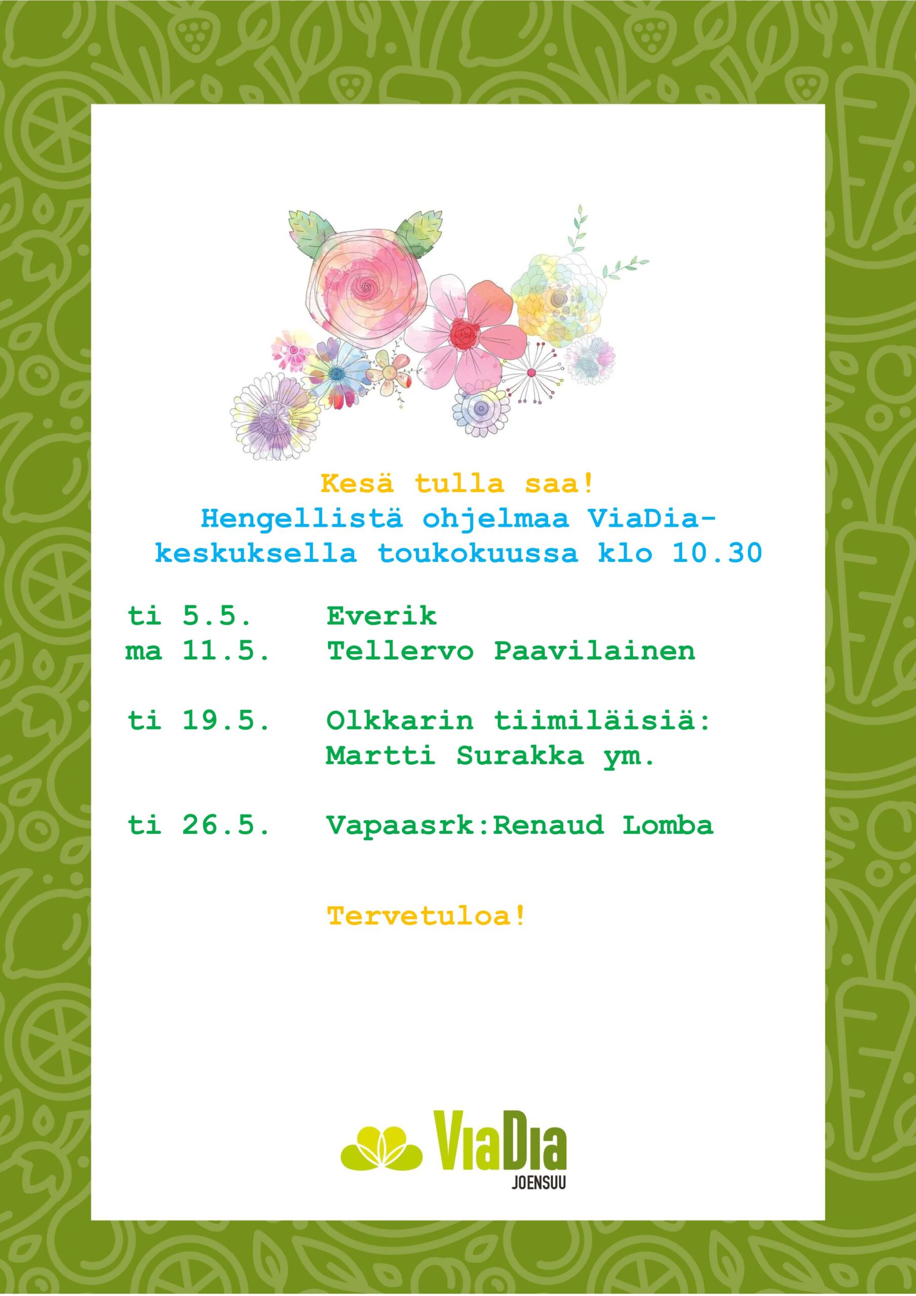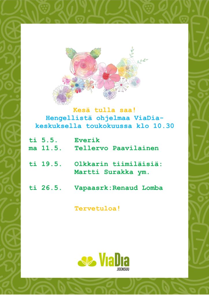 Hengellistä ohjelmaa ViaDia-keskuksella toukokuussa Heidi Parkkinen22.4.2026 Uncategorized ← ViaDia-keskuksen kevään-kesäajan 2026 aukioloajat