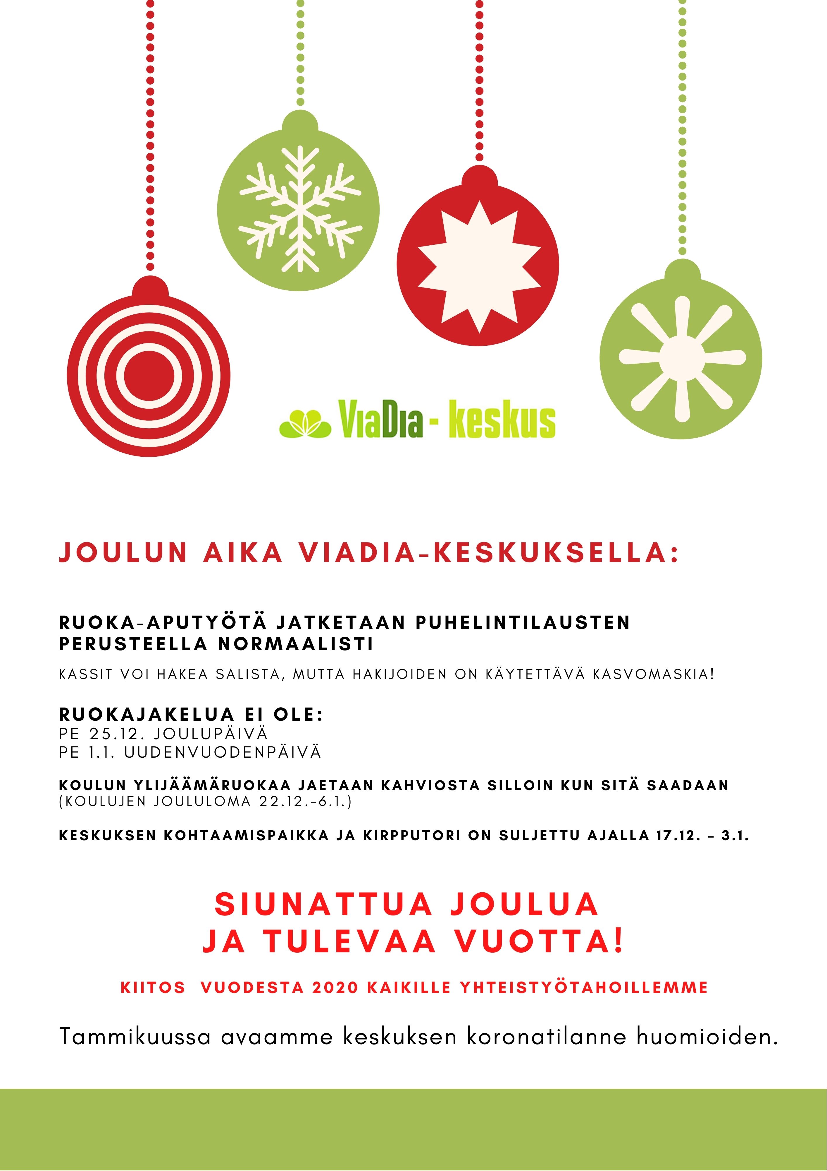 Joulun aika ViaDia-keskuksella Johanna Mustonen7.12.202021.12.2020 Uncategorized SIUNATTUA JOULUA JA VUOTTA 2021! ← Ajankohtaista ViaDia-keskuksen toiminnassa 20.11. alkaen Lähiötalo joulutauolla 18.12.2020 – 6.1.2021 →